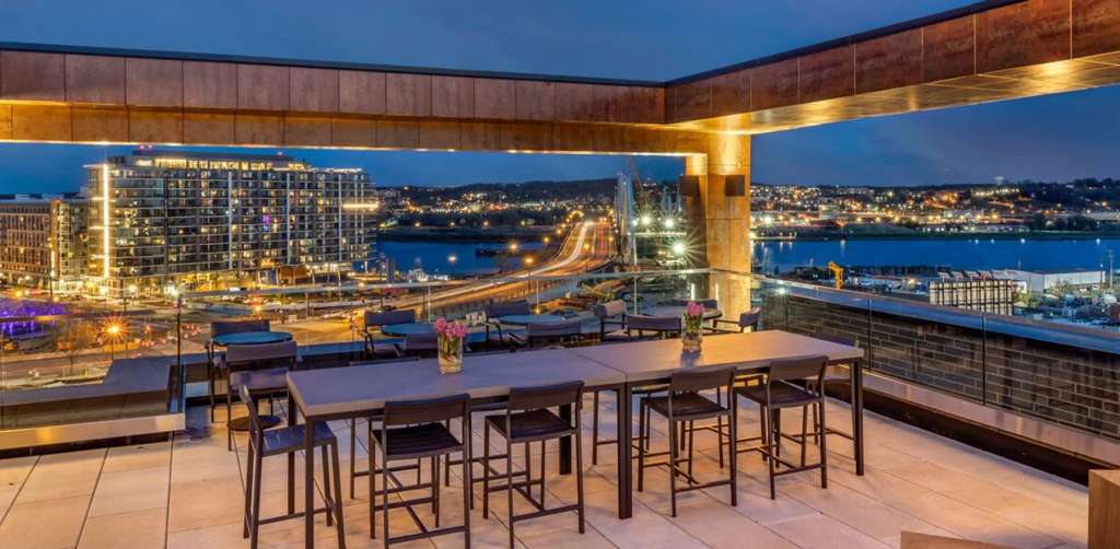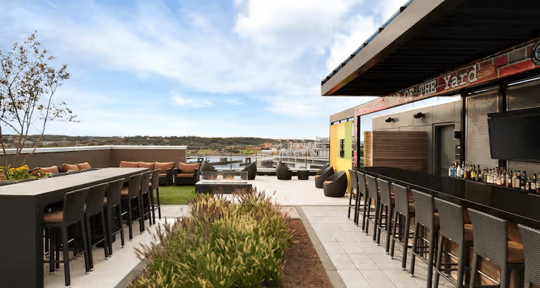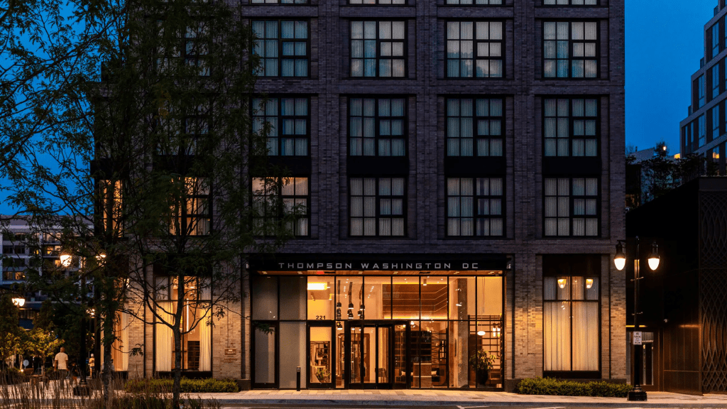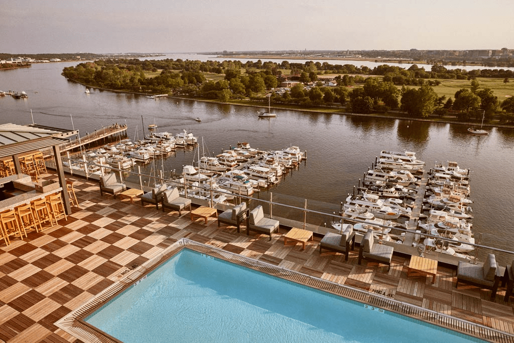 Thompson Washington DC is a luxury hotel located directly in Navy Yard, offering upscale accommodations with sleek, industrial-chic designs. The rooftop bar provides stunning views of the river and the city skyline.