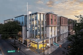 Pros: Extra-large rooms with 16–20’ ceilings, daily wine & cheese reception, rooftop garden lounge.