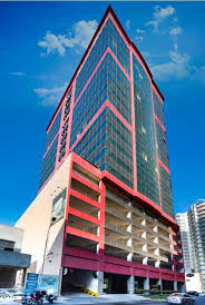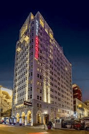 Modern, upscale hotel with a glass-enclosed indoor pool.